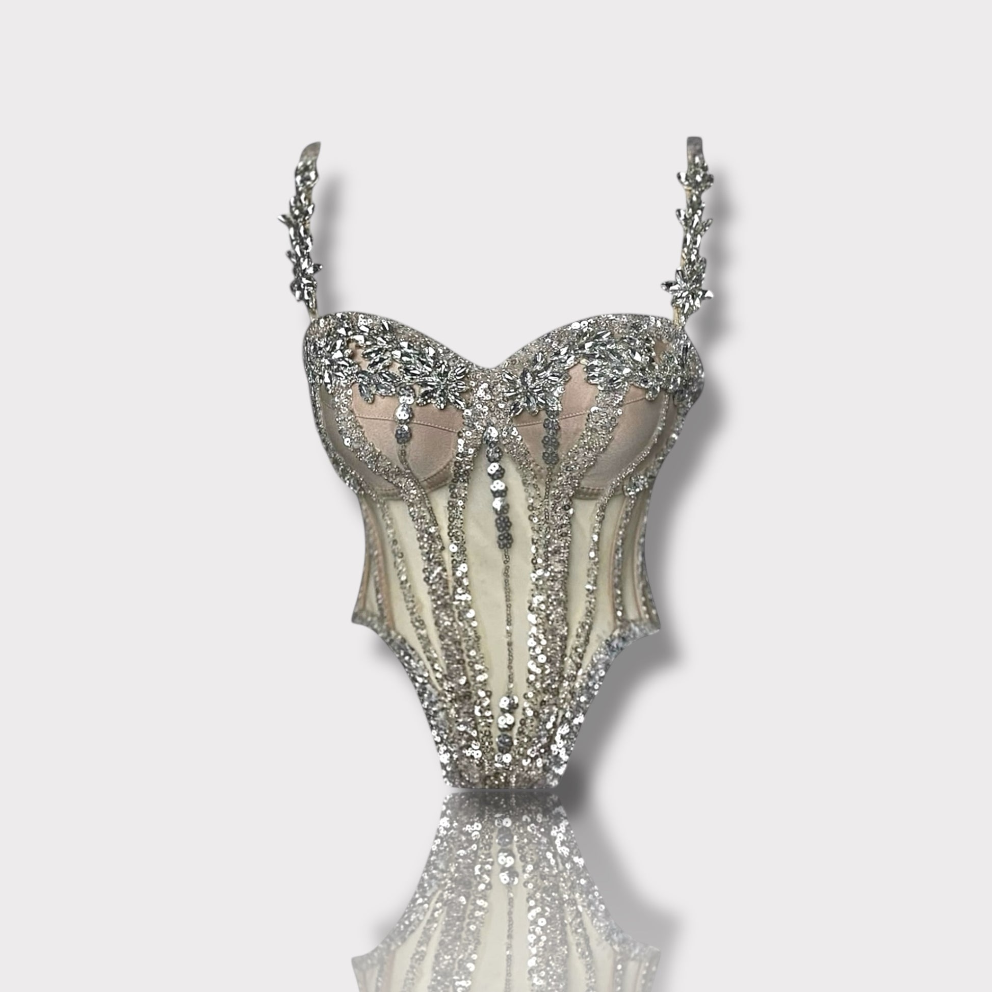 Adjustable corset in sizes 34-36 and 36-38, customizable with back lacing.