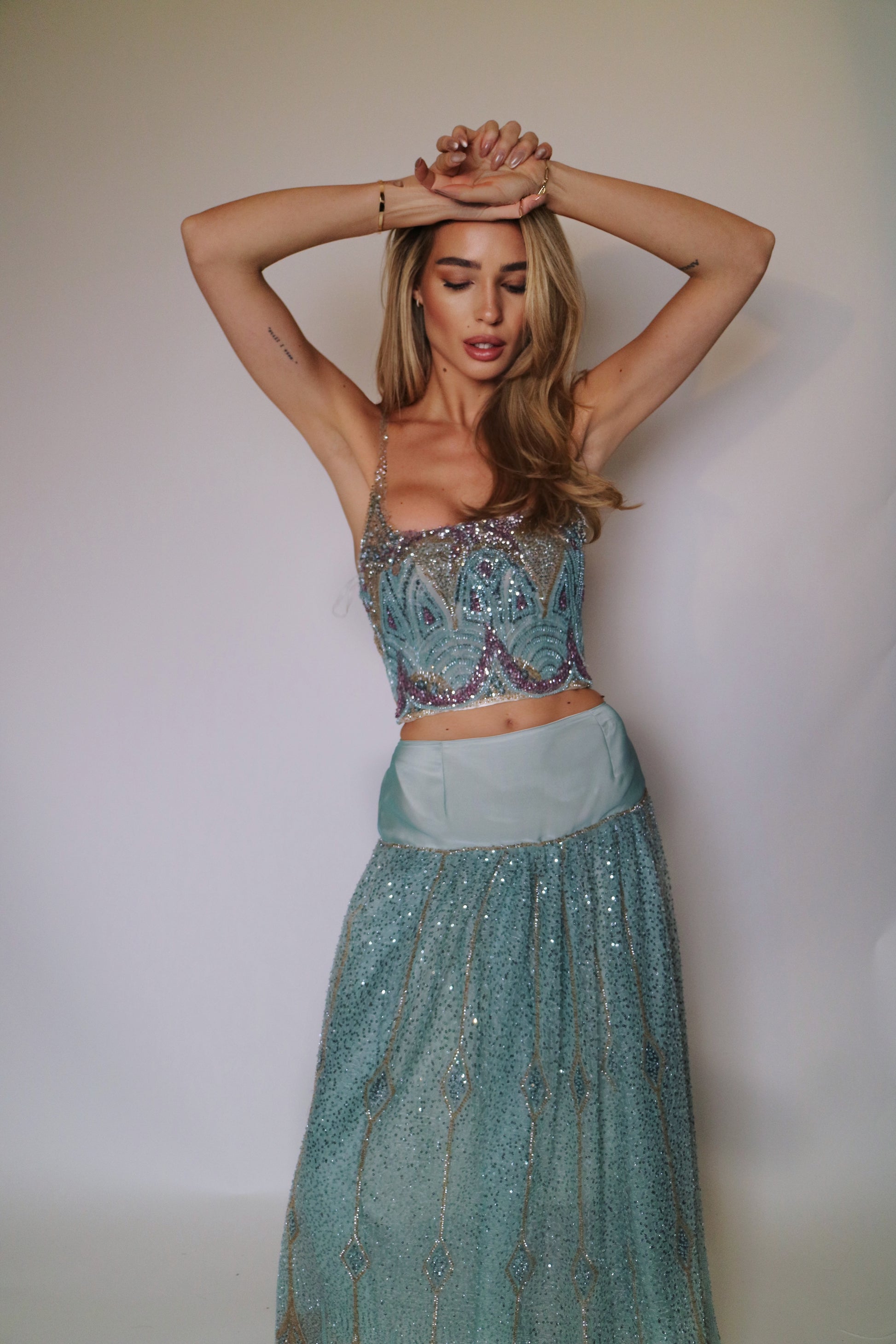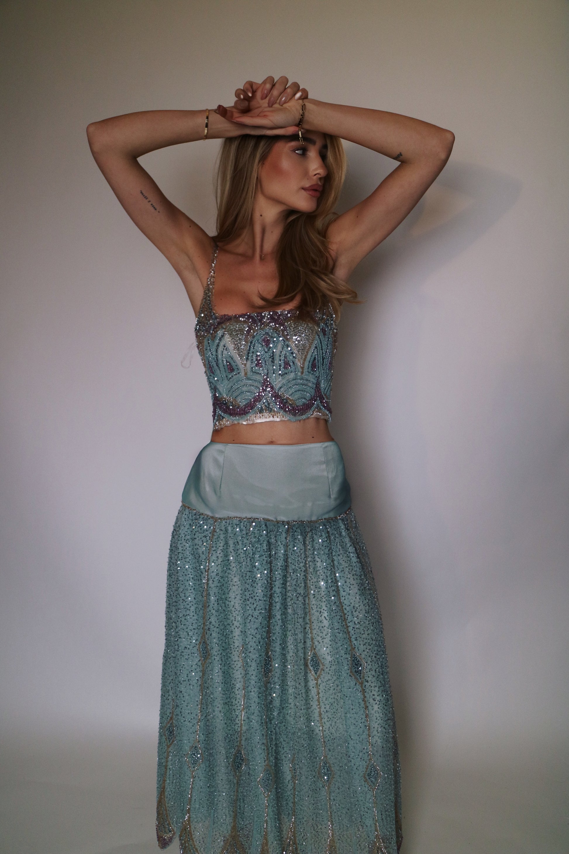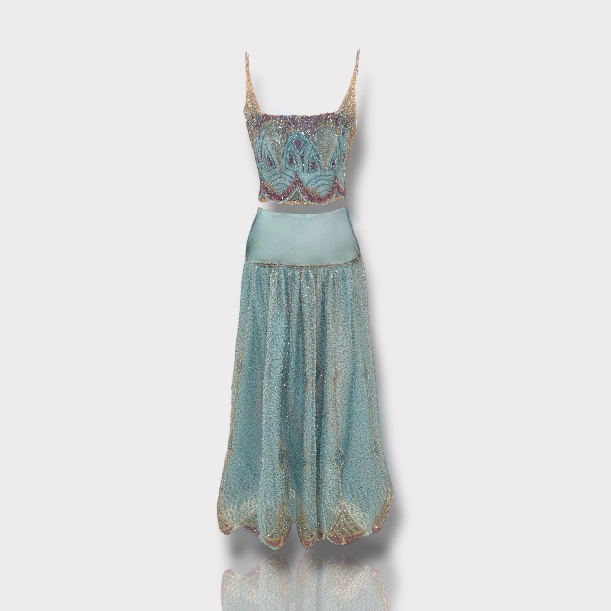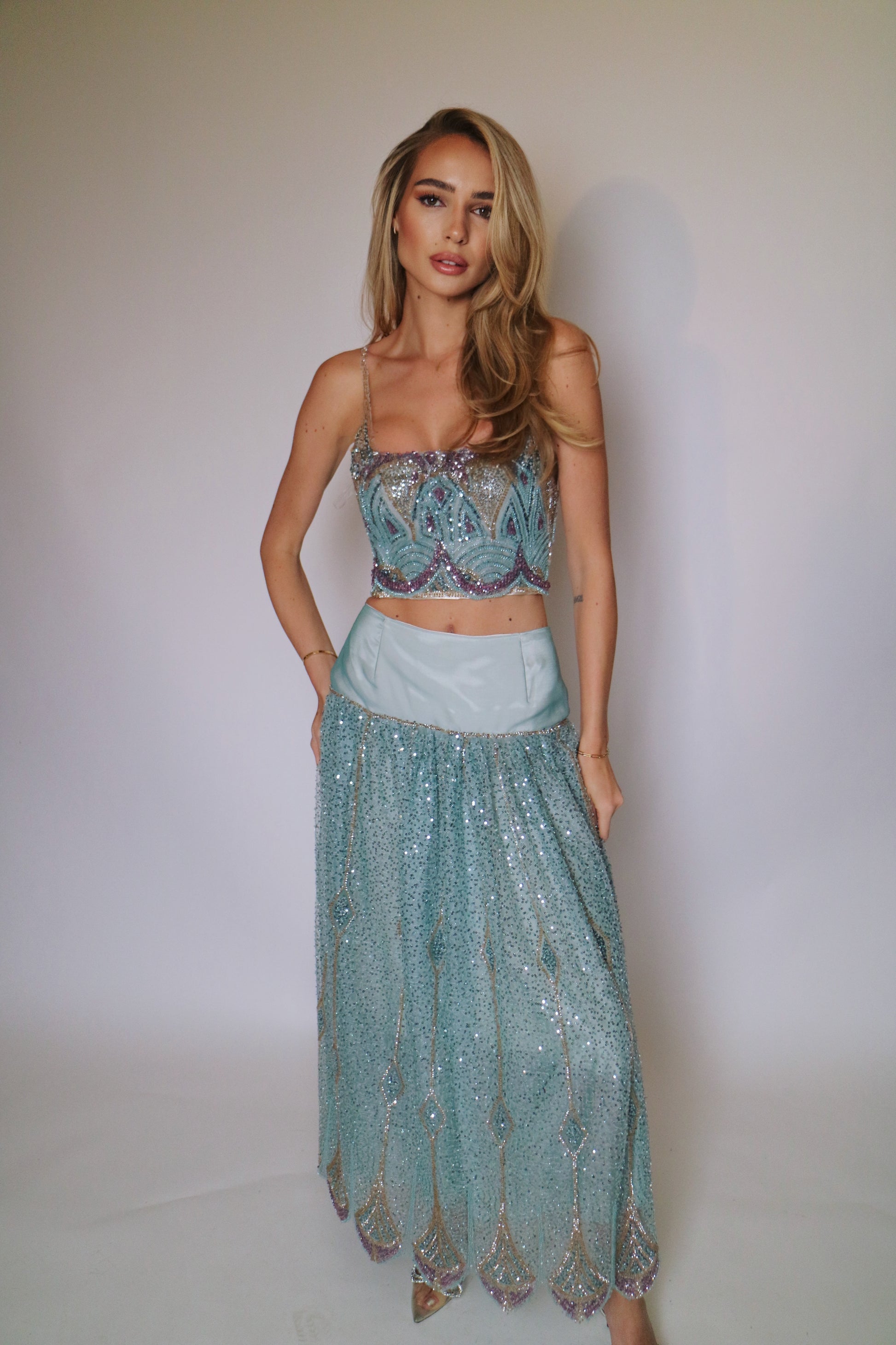 This full-length Camélia set brings timeless sophistication to life. Designed with a sculpted corset and a flowing ankle-length skirt in soft mint chiffon it speaks of delicate strength. Subtle hand embroidery completes the look making Camélia a graceful tribute to femininity and quiet luxury.